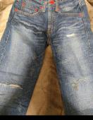 ダメージ加工が施されたダークブルーのデニムで、カジュアルなスタイルに最適です。