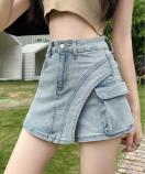 アシンメトリーカットの被せが個性的で、ユニークな印象を与えるレディースデニムショートパンツです