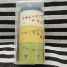 青い取っ手付きフタ・白・黄色・黄緑色とカラフルなランチボックス。