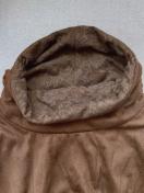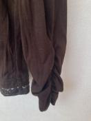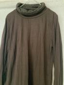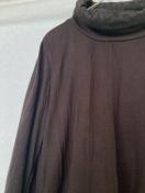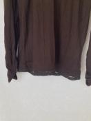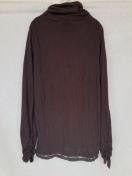 ダークブラウンのタートルネック長袖カットソー、裾にレース付きでスタイリッシュ。
