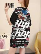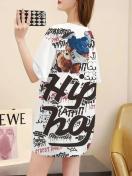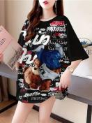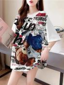 シックなプラスサイズの女性用カートゥーンプリントTシャツ - カジュアルクルーネック、半袖、ストレッチ生地のミドル丈トップ