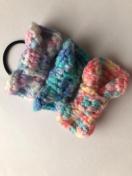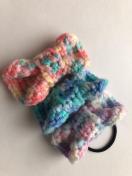 抗菌防臭毛糸で丸っこいリボンを編んで、ヘアゴムを作りました。