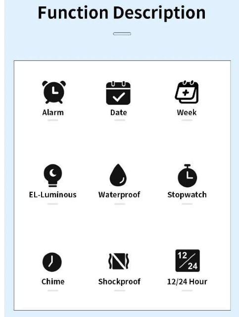 機能: 耐水性、アラーム、12/24時間、クロノ、ELライト、日付、週、月、7種のバックライト