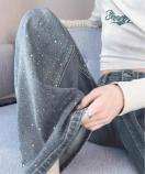 ラインストーンが散りばめられ、動くたびにきらきらと輝く、存在感抜群のレディースデニムパンツです