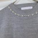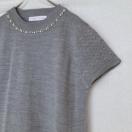 デコルテのパール、ビーズ装飾がおしゃれなキャプスリーブ、ニットのトップスです。