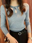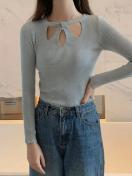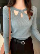 クロスフロントカットアウト長袖ニットトップ(女性用)- スリミングビスコースセーター、ラウンドネック、秋/冬に最適、洗濯機可