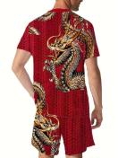 メンズノベルティドラゴンデジタルプリントアウトフィットセット、メンズショートスリーブTシャツ&ポケット付きドローストリングショーツセット、夏のストリート用
