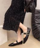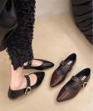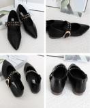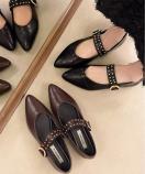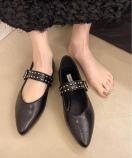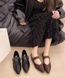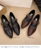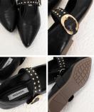 洗練されたポインテッドトゥとスタッズ付きストラップが印象的な、クラシカルモダンなフラットパンプスです