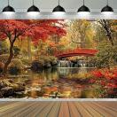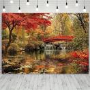 レトロスタイルの京都庭園の滝と紅葉の橋の背景 - 春と夏のイベントに最適な多目的パーティー装飾 - 電気不要