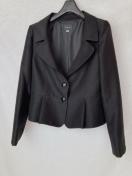 シンプルな黒のテーラードジャケット、2つのダイアモンドカットボタンが特徴。
