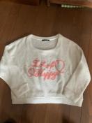 ホワイトのクロップドニット、ロゴ刺繍とパール装飾付き。