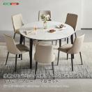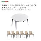 この商品は、光沢のあるセラミック天板が特徴の伸縮式円形ダイニングテーブルとダイニングチェア6脚のセットです。テーブルは80cmから130cmまで拡張でき、実用性と美しさを兼ね備えています。チェアはPVCレザーの座面とラバーウッド製の安定した脚部が、モダンな空間に調和します。