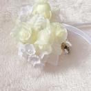 白とオフホワイト の花を使用したエレガントなブローチ。