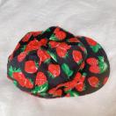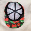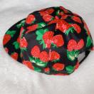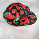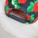 イチゴ柄のカラフルなキャップで、個性的なスタイルを演出。