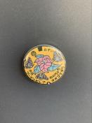 花と蝶のデザインの金属製缶バッチ。