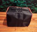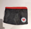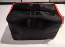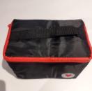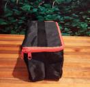 シンプルな黒のランチバッグ、赤のアクセント付きで、ナイロン素材のスクエア型