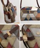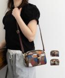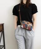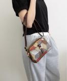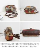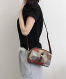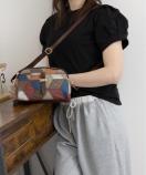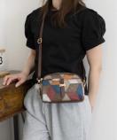 温かみのある色合いとユニークな幾何学模様が特徴のショルダーバッグです