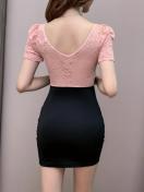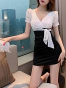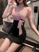 セクシーVネックショート丈ドレス、ウエストリボン付き、ポケット付き