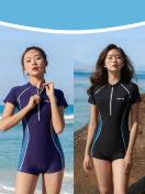 レディース ワンピース スポーツ水着、半袖クルーネック、高伸縮ナイロン生地、速乾性、無地カラーブロック、取り外し可能な胸パッド、高弾性、200g/u生地重量、サーフィン、ウォータースポーツ、水泳、ビーチ、アウトドアアクティビティに最適