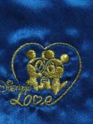 。青色(紺色)の地に金色の刺繍(ミッキー ミニー 等) エンジ色の紐で巾着袋になります