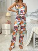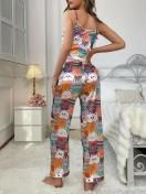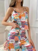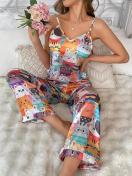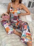 女性の漫画猫プリントパジャマセット - ポリエステルとエラスタンブレンド、カジュアルなスパゲッティストラップトップとマッチングパンツ、非ストレッチ素材、10代と大人のための夏のラウンジウェア