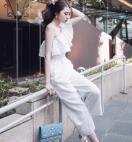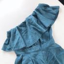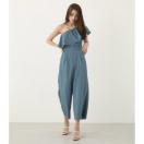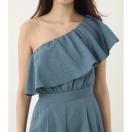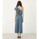 ワンショルダーの立体的なデザインが顔周りを華やかに見せ、またストレート寄りのワイドPTのシルエットがモードな印象に