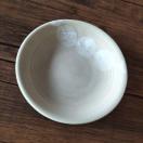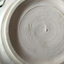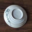 手書きの文字が特徴的な白い陶器の浅い皿。
