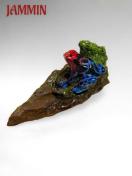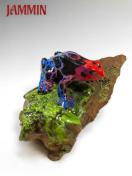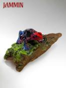 流木の上にカラフルなヤドクガエルが乗っている置物です。