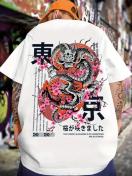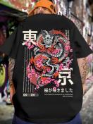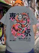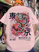 メンズ Y2K ドラゴン&桜グラフィックTシャツ - ピンクのカジュアルサマーティー、太字の日本プリント、半袖、クルーネックデザイン、都市ストリートウェア | Y2Kファッション | ストレッチ生地