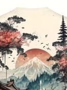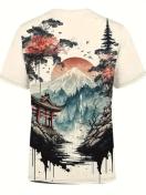 レトロな絵画スタイルの森と山の柄のクルーネックと半袖Tシャツ、夏のスタイリッシュでシックなトップス、メンズアウトドアレジャーウェア