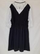 レースの半袖とジャンバースカート風のVネックデザイン、フレアスカートドレス、ウエストにはベルト風装飾ボタン付き。