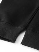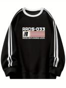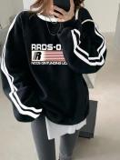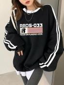 女性用カジュアルブラックプルオーバースウェットシャツ、ダブルバーレタープリント、長袖 - ブレンド、ラウンドネック、ストライプカフス&ヘム、秋/冬に最適
