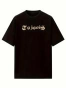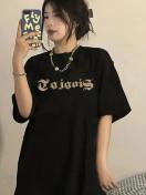 レディース カジュアル ルーズフィット 半袖Tシャツ - ブラック ゴールデン文字プリント、ポリエステル100%、ラウンドネック、洗濯機可、春夏カジュアルアティア、レディースTシャツ