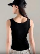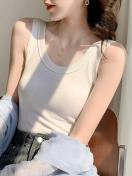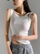 レディース カジュアル リブタンクトップ、無地ニットベスト サイドストライプディテール、ローネック ポリエステル キャミソール オールシーズン対応、万能レイヤリングアイテム