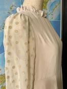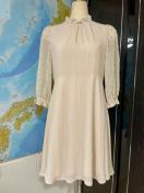 クリーム色のAラインドレス、ドット柄のシフォン袖とフリル襟が特徴。
