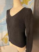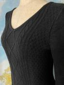 Vネックのケーブル編みデザインの黒い長袖ニットセーター。