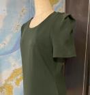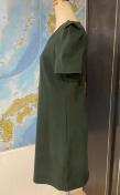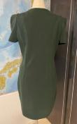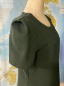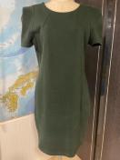 ダークグリーンのタイトフィットひざ丈ワンピース、ラウンドネックと半袖デザインが特徴。