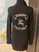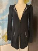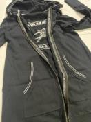 フルジッパーの黒いロングパーカー、背面にBLUE LABELの刺繍あり。