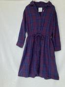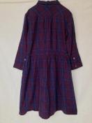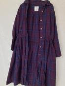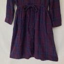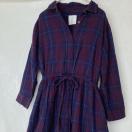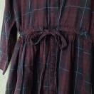 パープルとブルーのチェック柄の七分袖シャツワンピース。ウエストに紐付きで、カジュアルなスタイルに最適。