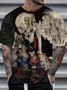 メンズ サムライスカルプリント 半袖Tシャツ - 日本の浮世絵アートワーク、ブラック&ホワイトグラフィックデザイン、カジュアルポリエステルクルーネックティー 春/夏用