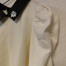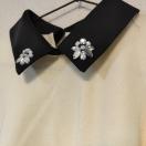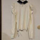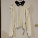 襟ビジュー付きニットプルオーバー、アイボリーのパフスリーブトップス、ブラックの装飾襟付き。