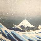 嵐を予感させる暗い空をバックに、大きなうねりをあげる波と、その向こうから顔を出す富士山。