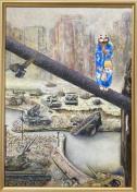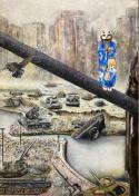 今回はとにかく戦車が描きたくて描きたくて、かと言って、通常の戦車戦では、当然、乗車している兵士や、周りを取り巻く歩兵等も居る訳で、まともに描いたら悲惨さばかりに目がいってしまうので、兵隊及び民間人も一切描かず、兵器と崩れた街のみを描き、後は八咫烏と八咫烏が殉ずる者のみにしました。構成の方が時間がかかってしまった位、構図は考え抜きました。
