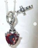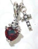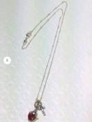 ルビーの様な赤い石が入ったハート形のトップ、ダイヤモンドの様なキラキラ煌めくストーンが7石入ったクロス 、2つのトップが寄り添うように揺れる、素敵なジュエリーネックレスです。