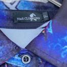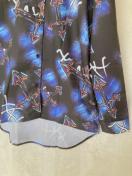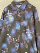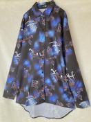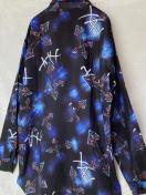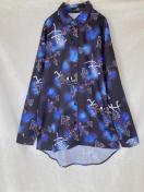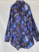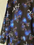 青と黒の独特なグラフィックデザインとクロス、十字架がプリントされた長袖シャツ。