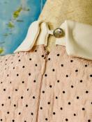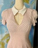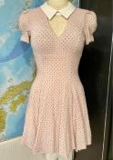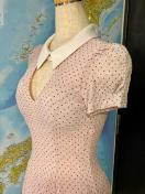 ピンクのドット柄、ホワイトの襟付き半袖ワンピース。