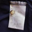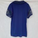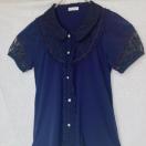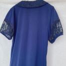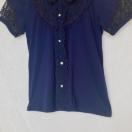 ネイビーのレース付き半袖Tシャツ、カットソー。前面にフリルとボタンが特徴。