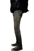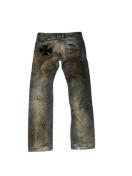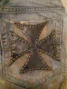 弊社デザイナーがリメイクした、唯一無二の存在感を放つ、カスタムリメイクデニム。 ヴィンテージ感のある色合いと、バックポケットの手刺繍クロスが、個性を強烈にアピール。