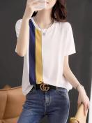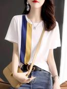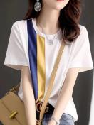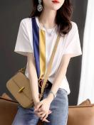 夏にぴったりのスタイリッシュなカラーブロックデザインの女性用半袖Tシャツ、多様なアウトフィットに最適です。