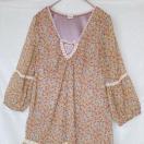 落ち着いたくすみカラー、花柄デザインの七分袖チュニック、レーストリム付きでエレガントな印象。